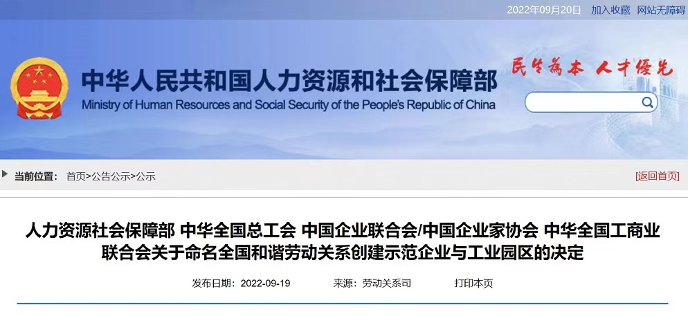 9月19日,人力资源社会保障部、中华全国总工会、中国企业联合会/中国企业家协会、中华全国工商业联合会联合发布《关于命名全国和谐劳动关系创建示范企业与工业园区的决定》,天江药业榜上有名,荣获“全国和谐劳动关系创建示范企业”称号,系江阴市唯一一家获此殊荣的企业。