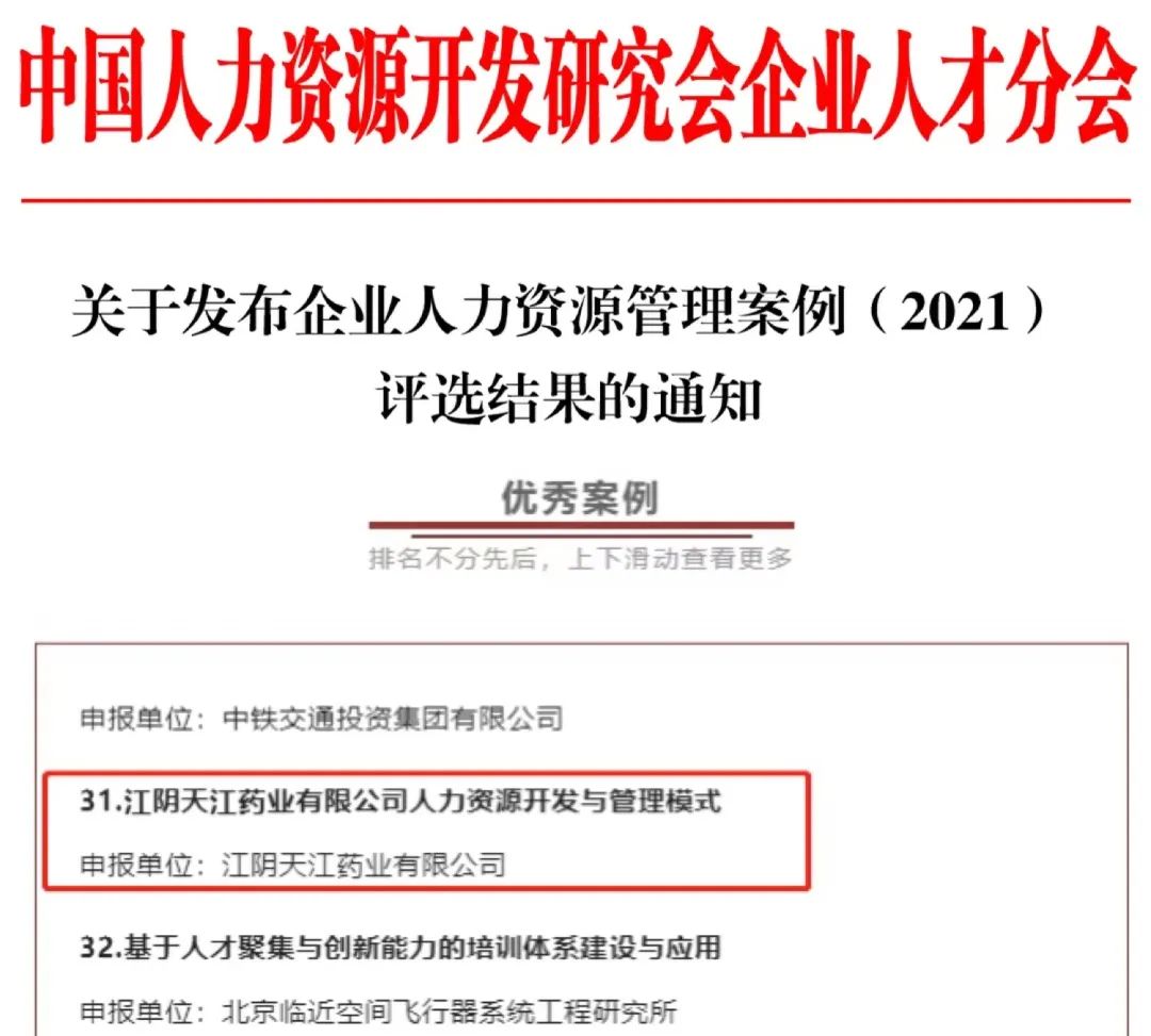 10月13日,中国人力资源开发研究会企业人才分会发布企业人力资源管理案例(2021)评选结果,国药集团中药控股所属天江药业在参与申报的300余家案例中脱颖而出,荣获“企业人力资源管理优秀案例”。