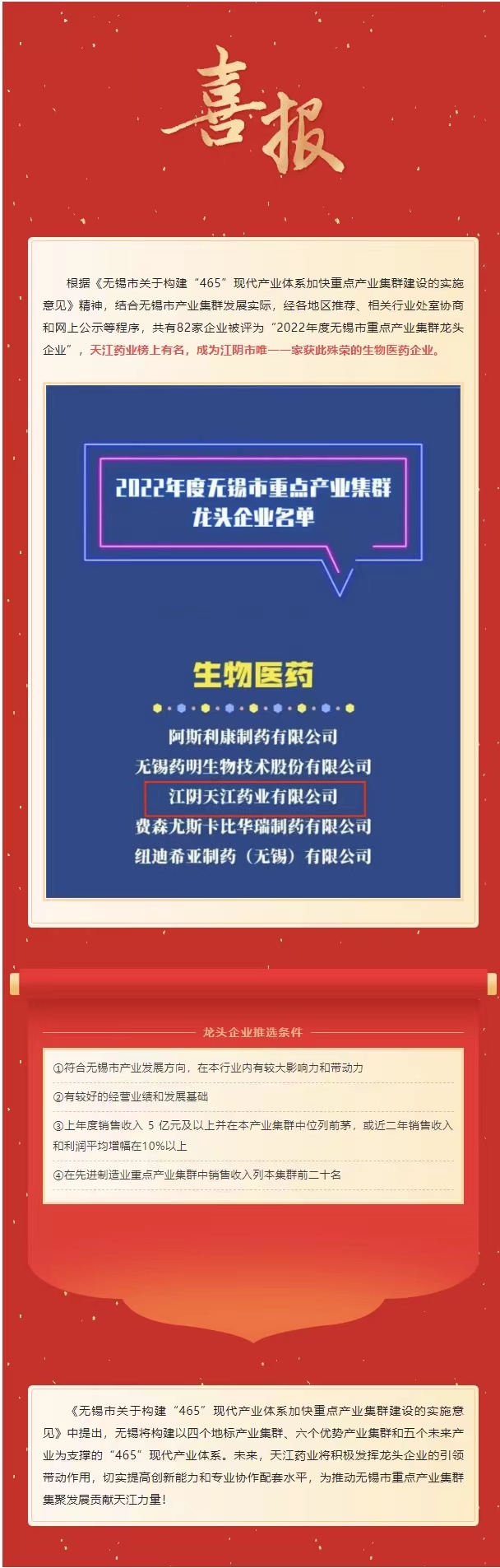 天江药业荣获“2022年度无锡市重点产业集群龙头企业”