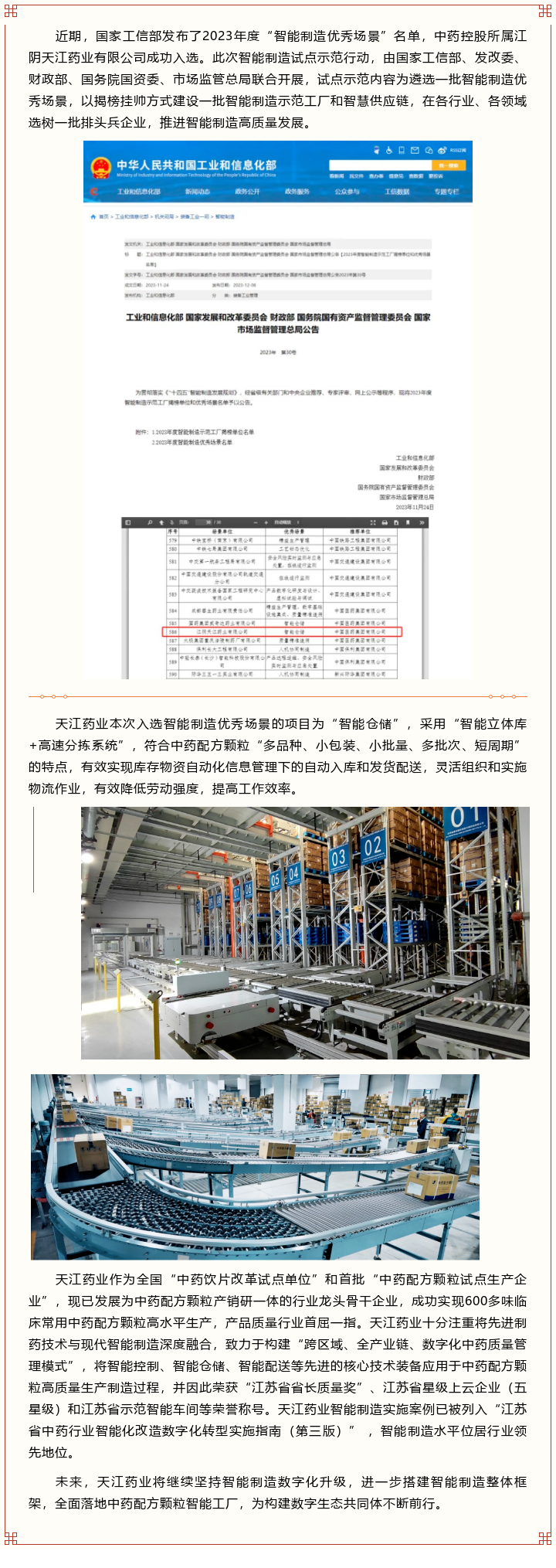中药控股天江药业入选国家工信部2023年度“智能制造优秀场景”