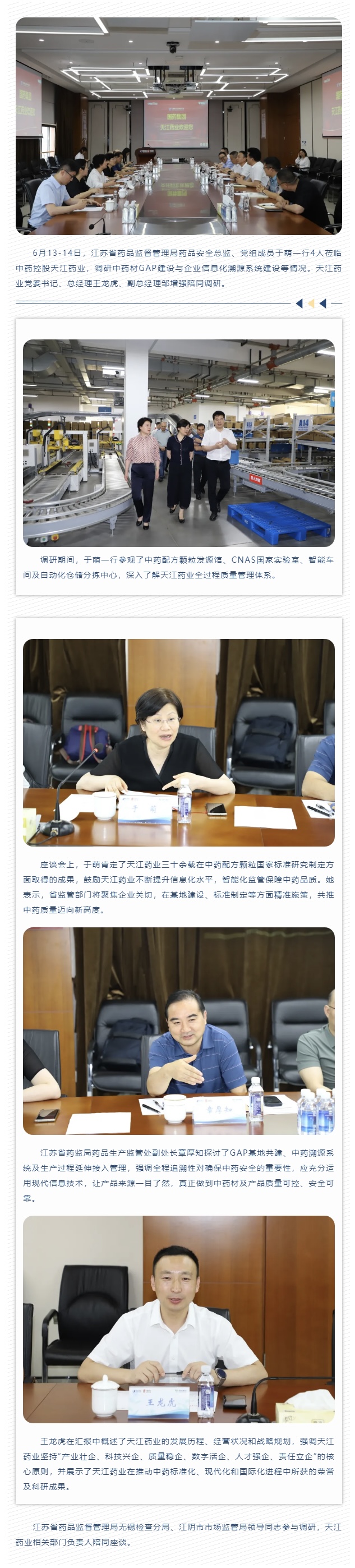 江苏省药监局药品安全总监于萌一行莅临中药控股天江药业调研指导