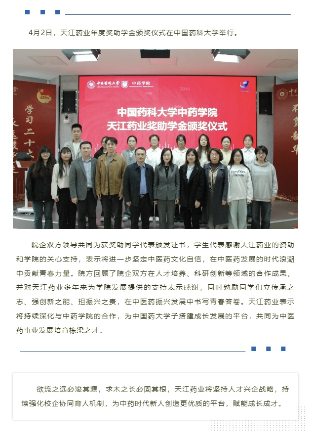 校企共育英才 携手传承发展——天江药业年度奖助学金颁奖仪式在中国药科大学举行