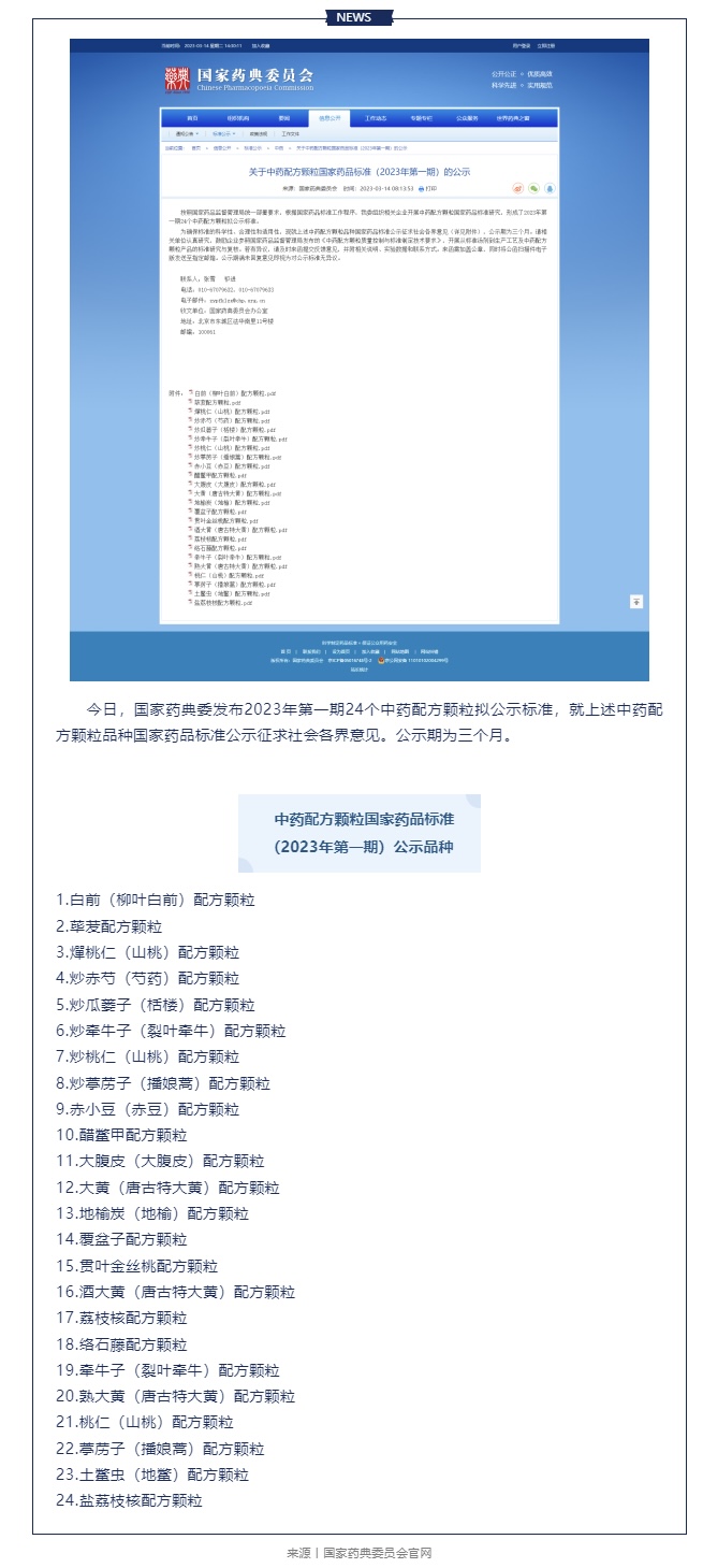 关于中药配方颗粒国家药品标准(2023年第一期)的公示