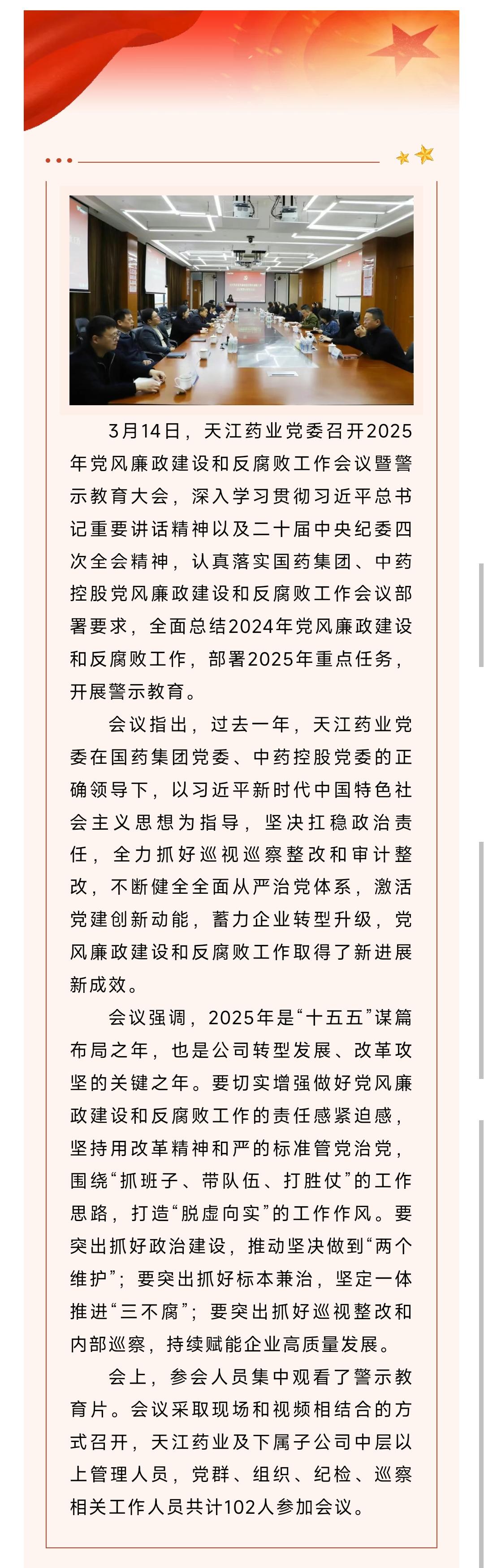 天江药业党委召开2025年党风廉政建设和反腐败工作会议暨警示教育大会