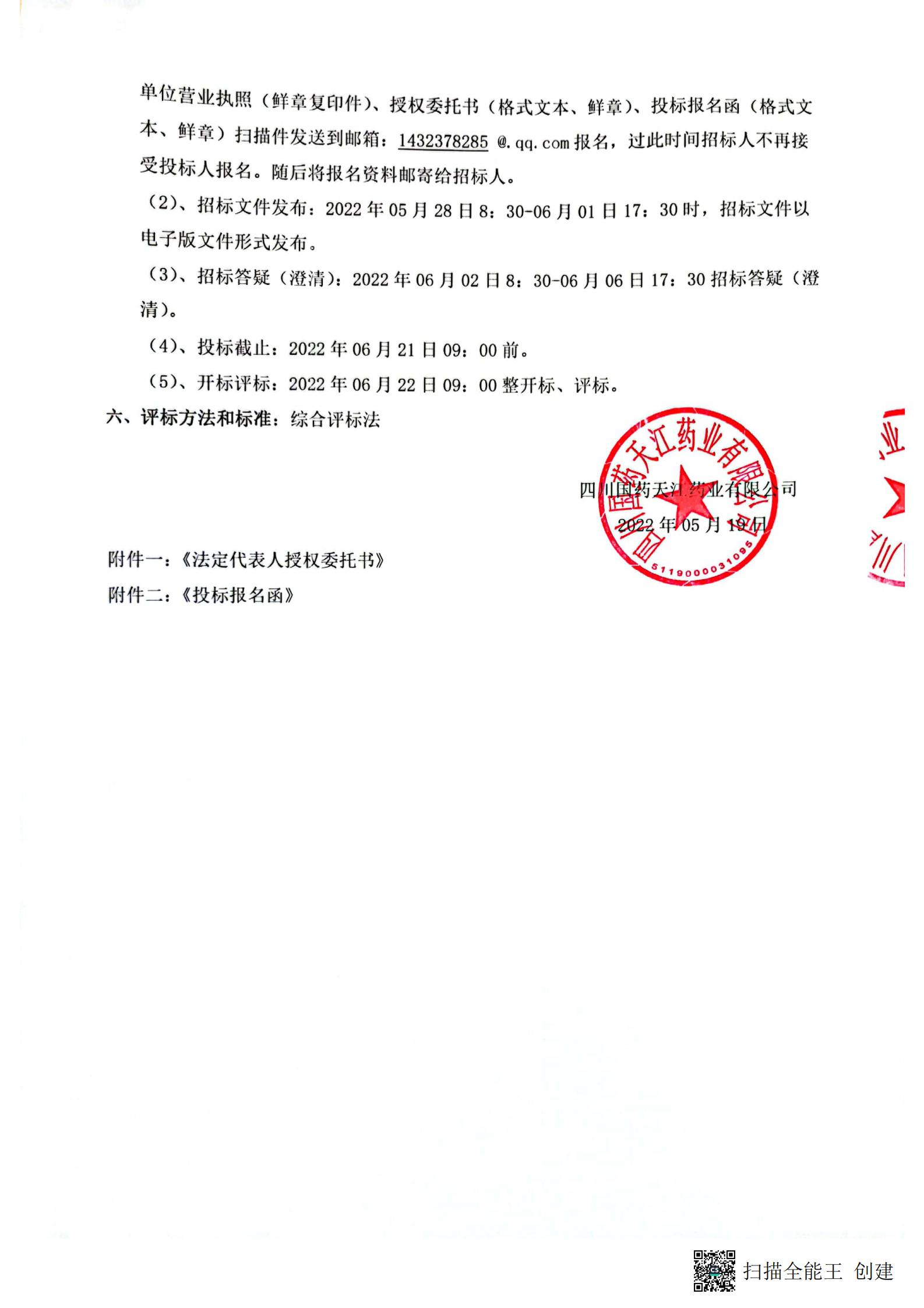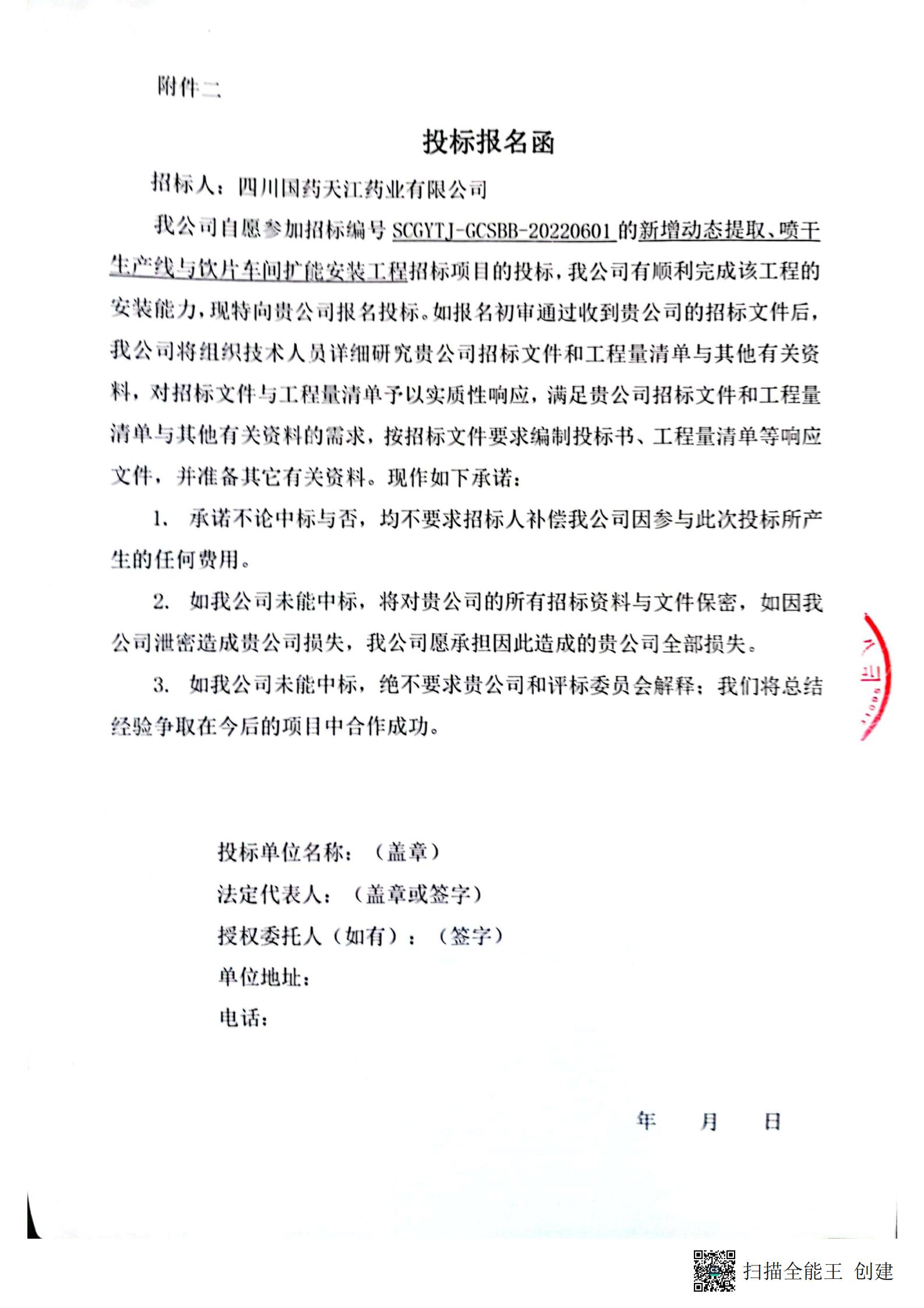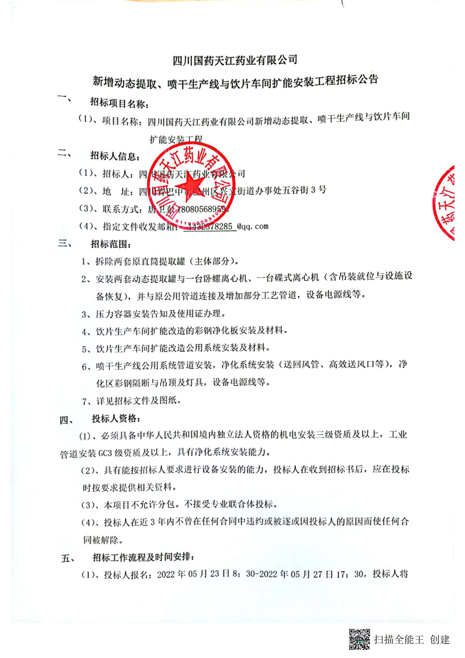 四川国药天江药业有限公司 新增动态提取、喷干生产线与饮片车间扩能安装工程 招标公告