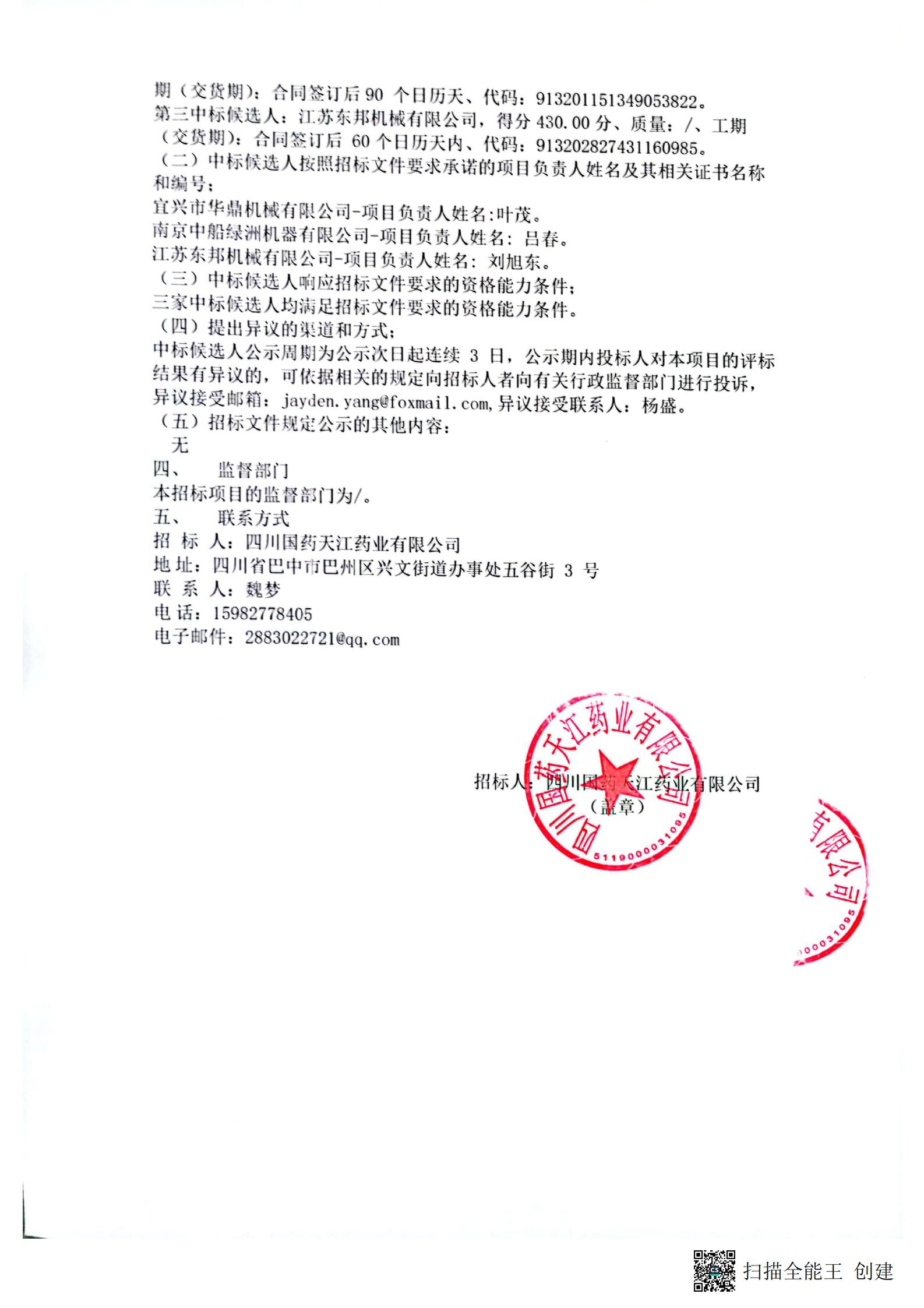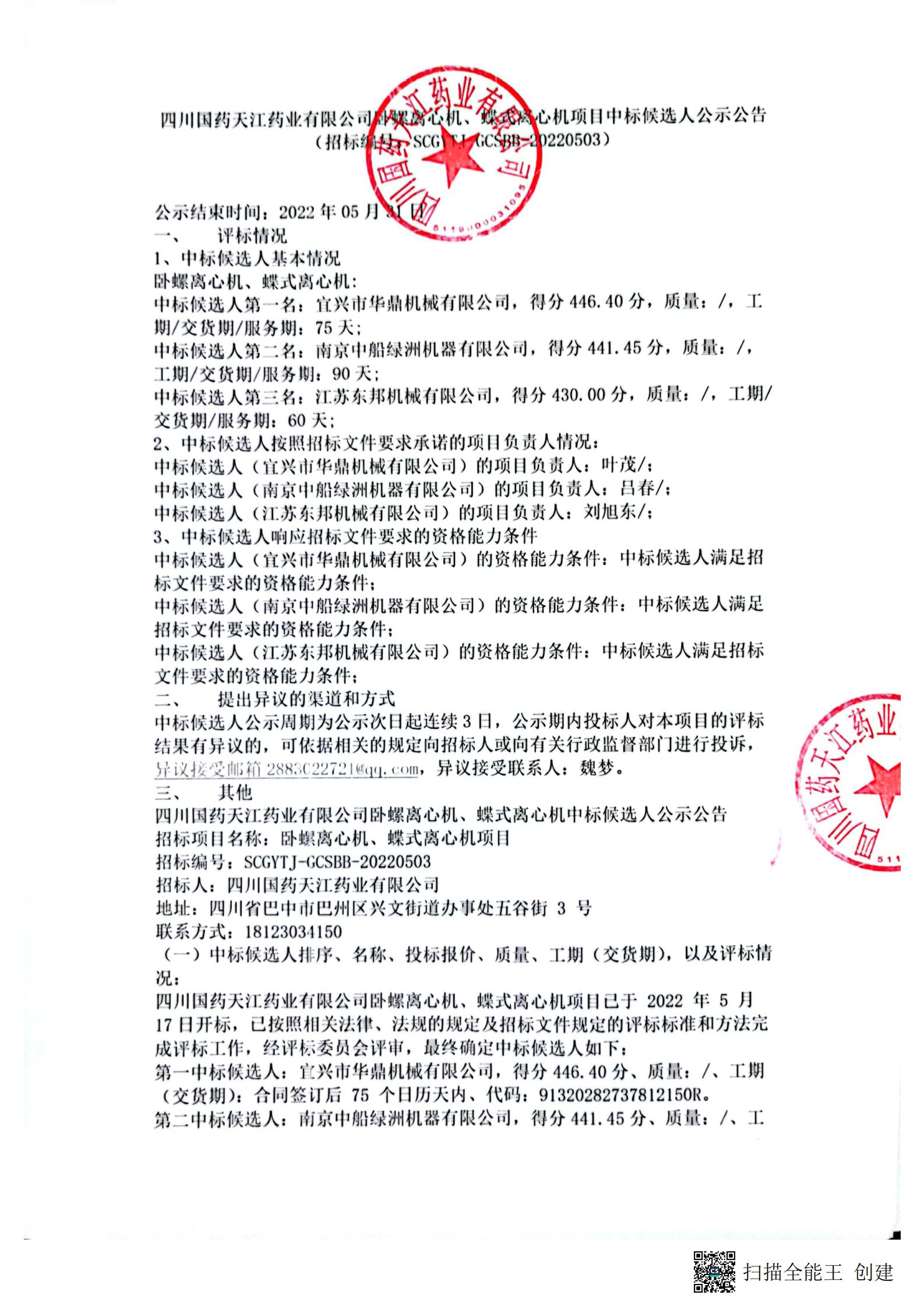 四川国药天江药业有限公司 卧螺离心机、蝶式离心机项目中标候选人 开云手机入口官网