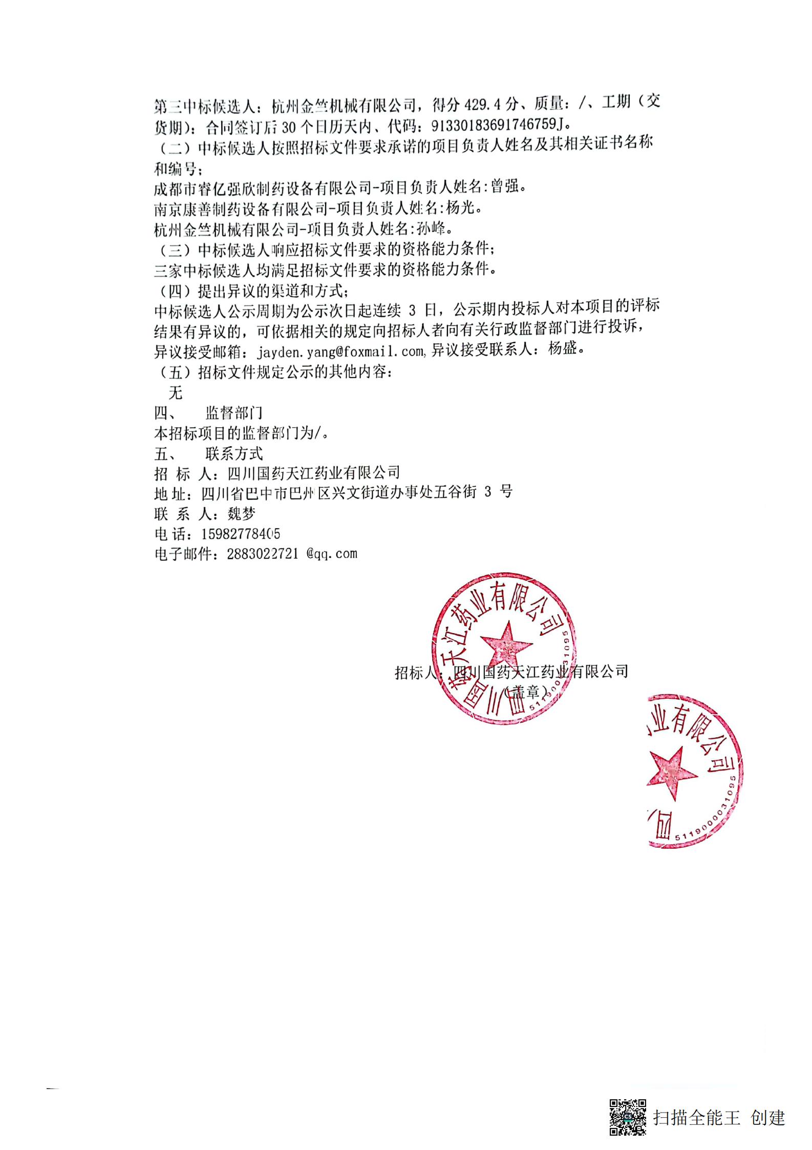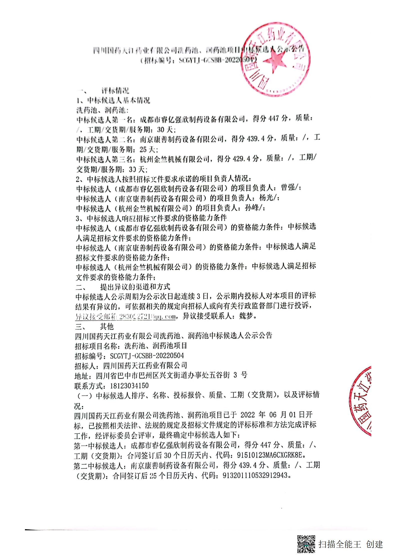 四川国药天江药业有限公司 洗药池、润药池项目中标候选人 开云手机入口官网