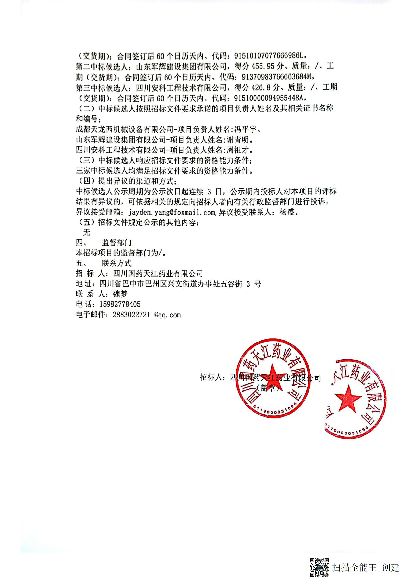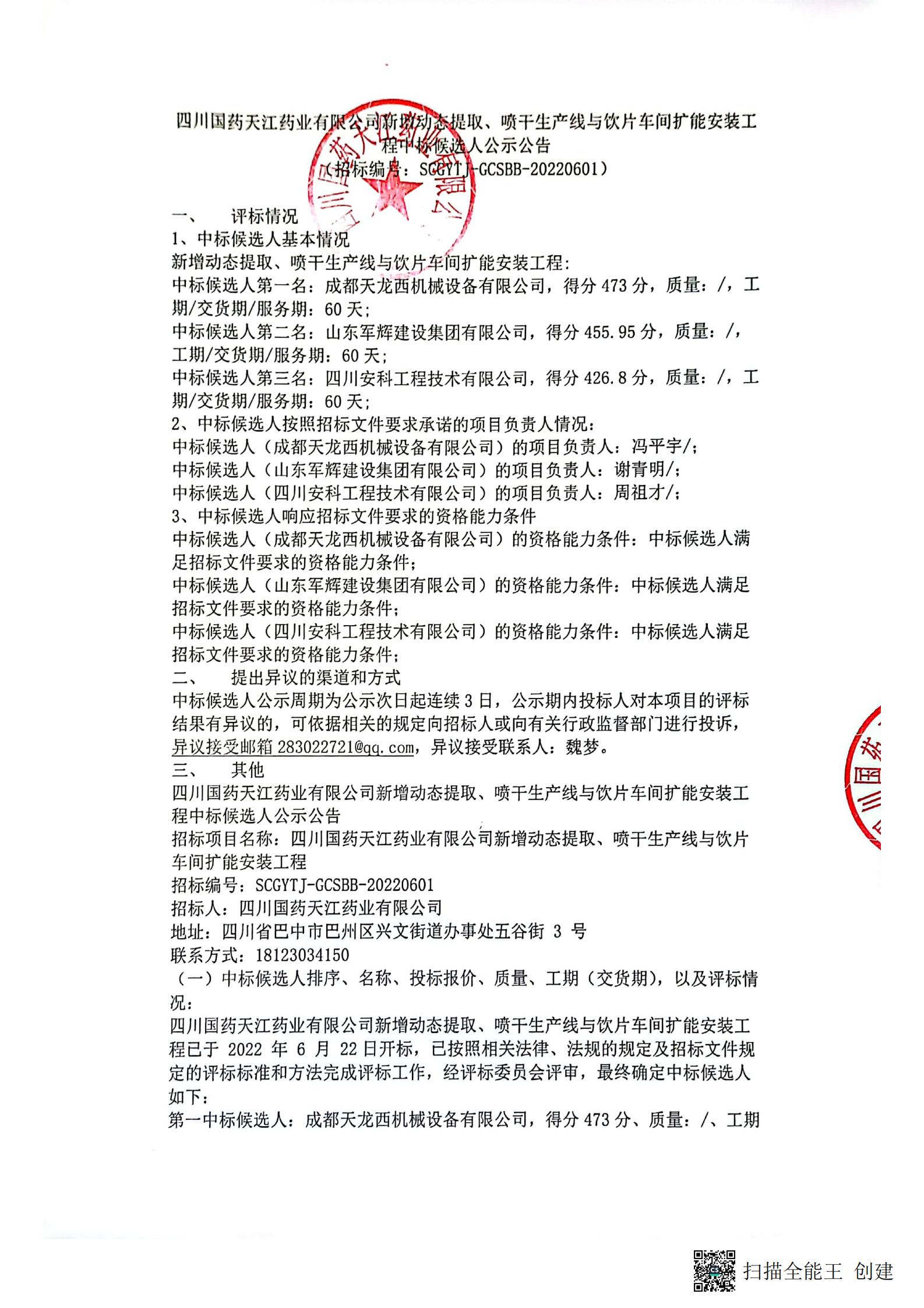 四川国药天江药业有限公司 新增动态提取、喷干生产线与饮片车间扩能安装工程中标候选人 开云手机入口官网
