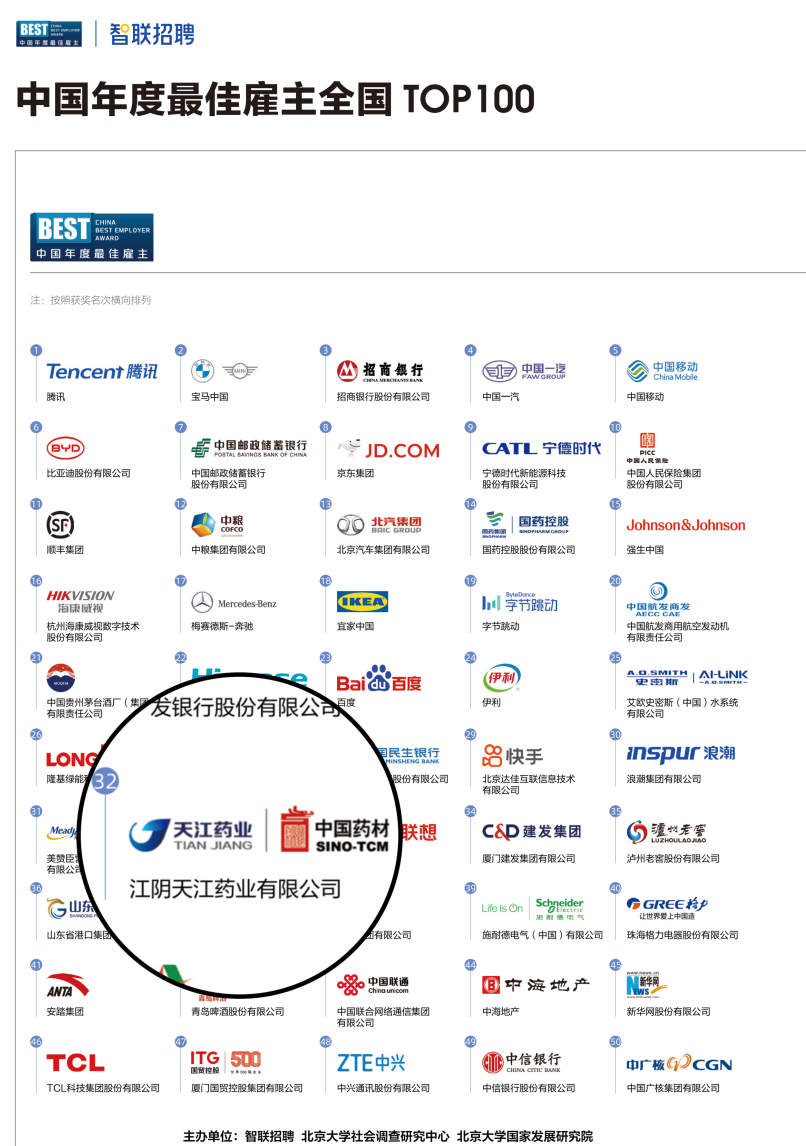 中药控股天江药业凭借特色的雇主品牌建设体系与丰硕的雇主品牌建设成果,从超10万家报名企业中脱颖而出,入围2023中国年度最佳雇主全国TOP100,位列第32位,是无锡地区唯一一家上榜企业。